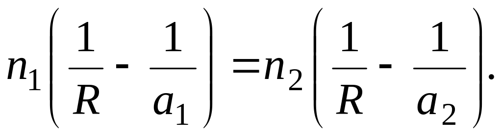 Введем правило знаков: все отрезки вдоль оси LL отсчитываем от точки S, считая их положительными, если они откладываются по ходу луча, и отрицательными – против хода луча. Тогда LS LA = a1, LS LA = a2 , где индексы 1 и 2 соответствуют средам с показателями преломления n1 и n2 . Радиус сферической поверхности SО = АО = R . (Заметим, что на рис.3 радиус кривизны R 0. Такая поверхность называется выпуклой. Если же R 0, то поверхность называется вогнутой.) Из треугольника LAО имеем:
