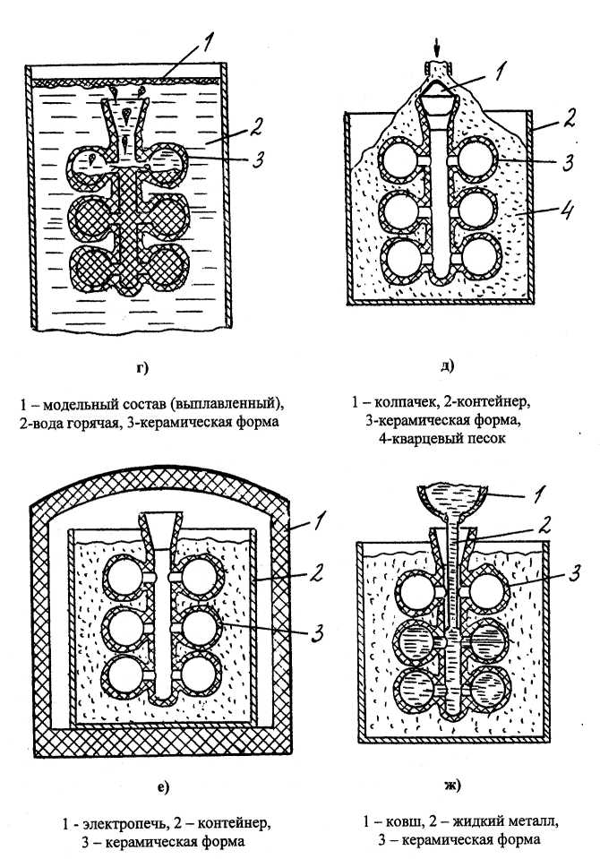 Рис. 3.1. Литье по выплавляемым моделям заготовки «Шар» из легированной стали (основные технологические операции, продолжение): г) Выплавление модельного состава (блока), д) Засыпка формы кварцевым песком, е) Прокалка формы в печи, ж) Заливка металла в форму