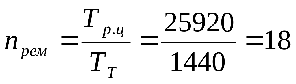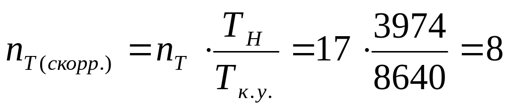 Поскольку нормы пробегов между текущими ремонтами Тт приводятся в справочниках для круглосуточной работы оборудования, то при периодических режимах работы в одну или две смены, рассчитанное ранее нормативное количество текущих ремонтов за ремонтный цикл, должно быть скорректировано. Эта корректировка осуществляется путем введения поправочного коэффициента Кр, учитывающего принятый номинальный режим работы оборудования в году Тн (в часах) по отношению к условному (максимальному) календарному годовому фонду времени Тк.у. (Тк.у. принимается равным 8640 часов)