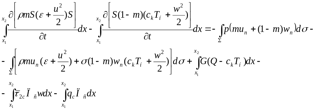 Полная энергия смеси в объеме W изменяется за счет притока энергии извне, работы сил давления на ограничивающей поверхности Σ, притока химической энергии за счет горения пороховых зерен, теплообмена с поверхностью канала и расхода механической энергии твердой фазы за счет трения «газа частиц» о поверхности ствола. Итак,