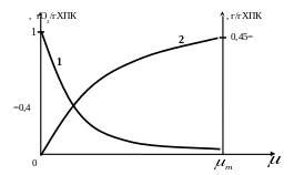 Рис. 2.6. Зависимость энергетического коэффициента (1) и экономического коэффициента (2) от удельной скорости роста