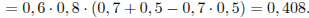 Чтобы поступить в институт на специальность «Лингвистика», абитуриент должен набрать на ЕГЭ не менее 70 баллов по каждому из трёх предметов — математика, русский язык и иностранный язык. Чтобы поступить на специальность «Коммерция», нужно набрать не менее 70 баллов по каждому из трёх предметов — математика, русский язык и обществознание. Вероятность того, что абитуриент З. получит не менее 70 баллов по математике, равна 0,6, по русскому языку — 0,8, по иностранному языку — 0,7 и по обществознанию — 0,5. Найдите вероятность того, что З. сможет поступить хотя бы на одну из двух упомянутых специальностей.