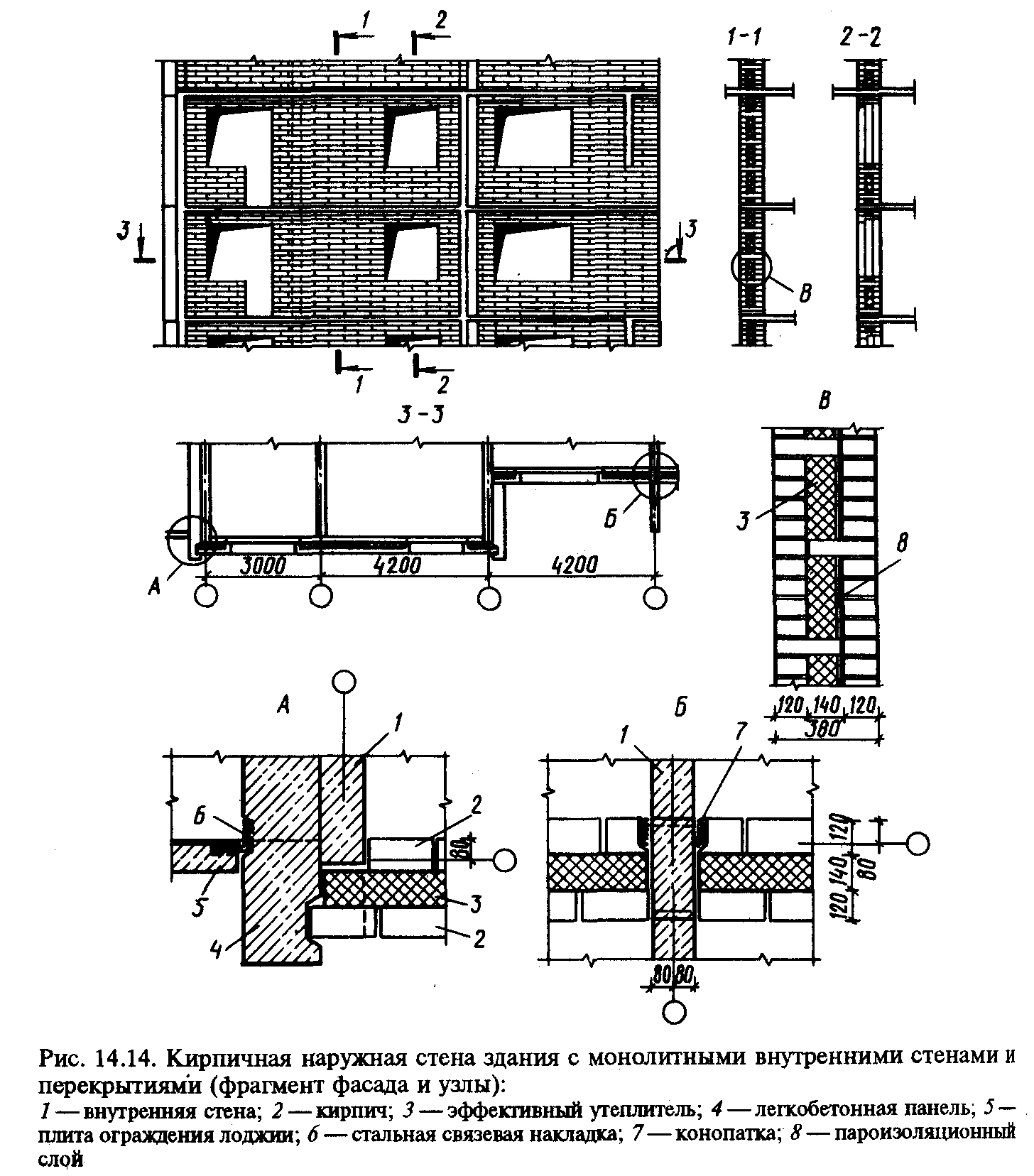Достаточно широкое применение получает в монолитном домостроении возведение самонесущих или ненесущих наружных стен каменной или облегченной кладки с эффективным утеплителем (рис. 14.14).