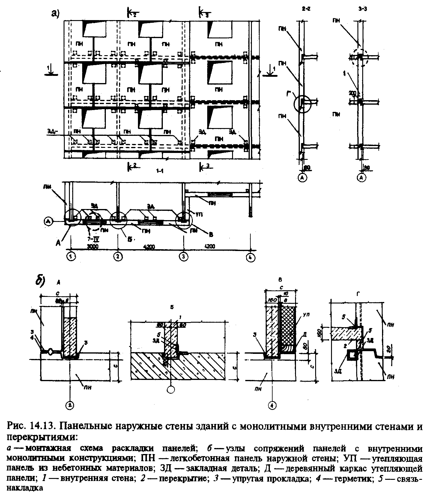 Сборные наружные стены выполняют преимущественно из легкобетонных навесных панелей. Из-за специфики технологии возведения наряду с обычными панелями однорядной разрезки оказывается особенно целесообразным применение панелей специальной разрезки с вертикальными швами по осям оконных проемов (рис. 14.13). При такой разрезке упрощается устройство стыков между панелями и с монолитными внутренними стенами.