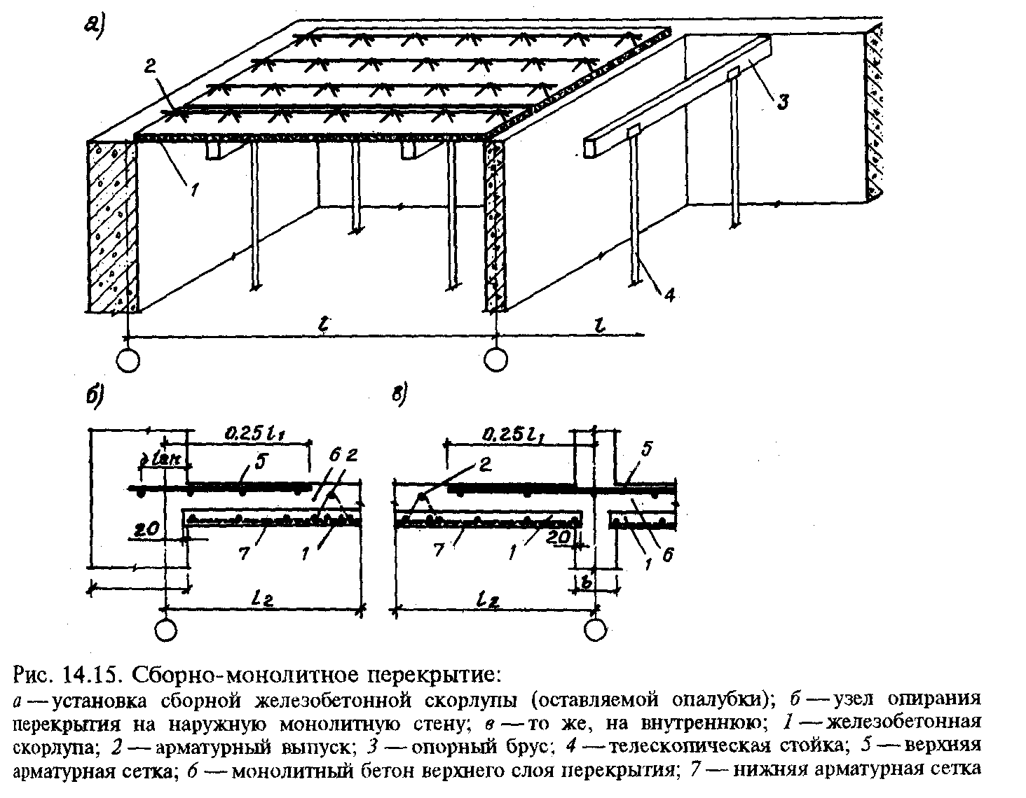 Сборно-монолитные перекрытия состоят по высоте из двух элементов: нижней железобетонной плиты толщиной 4…6 см, выполняющей функции несъемной опалубки, и верхнего монолитного бетонного слоя толщиной 10... 12 см (рис. 14.15).