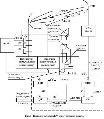 При неправильном положении нуля азимута оно может быть скорректировано с помощью сельсинной передачи от блока установки нуля азимута БВ-012 по показаниям неоновых лампочек ВЛЕВО и ВПРАВО, установленных на передней панели блока БК-006. При правильном положении опорного сигнала «36» относительно ЗИ обе лампы загораются одновременно.