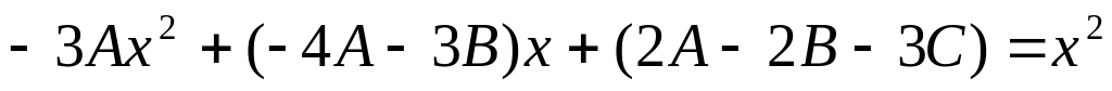 Для нахождения А, В, С мы должны приравнять коэффициенты при одинаковых степенях в правой и левой частях равенства. В правой части присутствует только член , это означает, что коэффициенты при остальных степенях равны нулю, а коэффициент при квадратичном члене соответственно равен 1. Приравнивая коэффициенты, получаем систему уравнений: