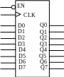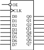 2. Микросхема 74x 374 – восьмиразрядный регистр на базе D-триггеров, управляемых фронтом синхросигнала. Имеет инверсный вход “Output Enable” – OE. Низкий уровень сигнала на этом входе переводит выходы триггеров в высокоимпедансное состояние.