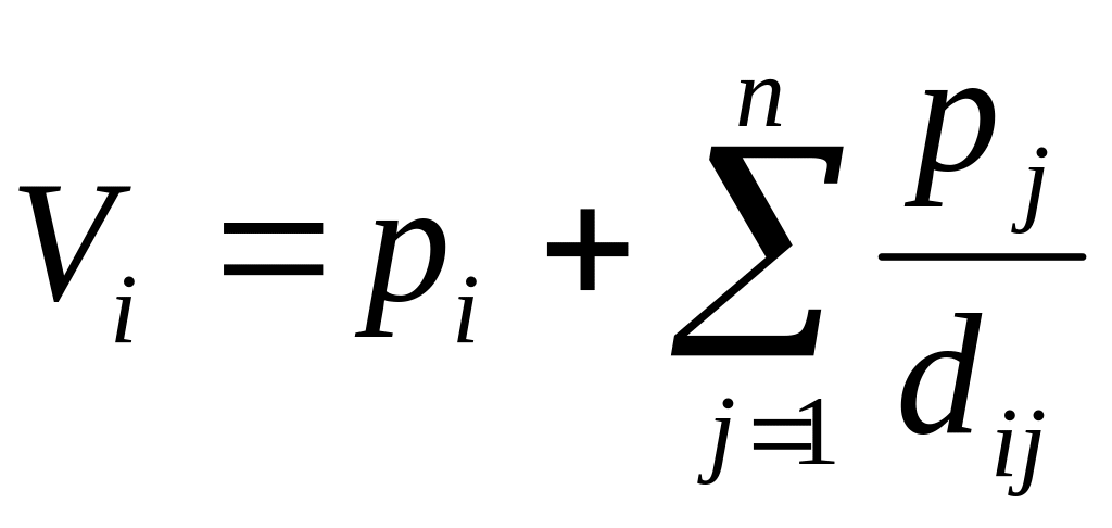 Для дослідження територіальних особливостей логістичного управління фармацією пропонується методика розрахунку потенціалів збуту лікарських засобів, транспортних витрат та індексів розміщення суб’єктів фармацевтичної галузі. Відповідно до гравітаційної моделі Ч. Гарриса, інтенсивність ділових зв’язків між ринками знаходиться в прямо пропорційній залежності від їх місткості та в зворотньо пропорційній – від відстані між ними. Тобто формула розрахунку потенціалу збуту лікарських засобів матиме такий вигляд: