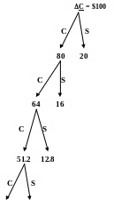 Предположим, что домохозяйство увеличивает свои автономные расходы на $100, т.е. покупает на эту сумму товары и услуги. Это означает, что производитель этих товаров и услуг получает доход в $100, который он тратит на потребление и сбережения. Предположим, что предельная склонность к потреблению мрс = 0.8, что означает, что из каждого дополнительного 1 доллара дохода экономический агент тратит на потребление 80 центов (т.е. 80%), а 20 центов (т.е. 20%) сберегает (т.е. предельная склонность к сбережению mрs = 0.2 ). В этом случае, получив $100 дополнительного дохода, производитель потратит $80 на потребление (Y х mрс =100 х 0.8 = 80) и $20 пойдут на сбережения (Y х mрs = 100 х 0.2 = 20). Потраченные им на потребление (на покупку товаров и услуг) $80 создадут дополнительный доход еще одному продавцу, который в свою очередь потратит $64 на потребление (Y х mрс = 80 х 0.8 = 64) и $16 сбережет (соответственно 80 х 0.2 = 16) и т.д. Процесс будет продолжаться до тех пор, пока прирост расходов не дойдет до 0.
