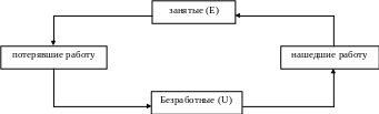 Для расчета естественного уровня безработицы может быть использована динамическая модель устойчивого уровня безработицы («модель динамики рабочей силы»), предложенная М. Фридманом, который исходил из того, что основной причиной безработицы является несовершенство информации. Часть занятых теряет работу, становясь безработными, а часть безработных трудоустраиваются и становятся занятыми. Эти перемещения (потоки) изображены на рис.7.3.