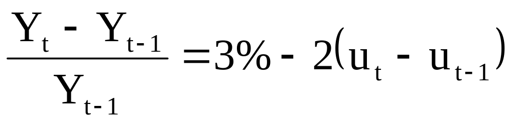 где Yt – фактический ВВП данного года, Yt - 1 – фактический ВВП предыдущего года, т.е. в левой части уравнения записана формула отставания ВВП по годам, u t – фактический уровень безработицы данного года, u t – 1 - фактический уровень безработицы предыдущего года, 3% - темп роста потенциального ВНП, обусловленный: а) ростом численности населения, б) ростом капиталовооруженности и в) научно-техническим прогрессом; 2 – это коэффициент, показывающий на сколько процентов сокращается фактический ВВП при росте уровня безработицы на 1 процентный пункт (это означает, что если уровень безработицы увеличивается на 1 процентный пункт, фактический ВВП сокращается на 2%). Этот коэффициент был рассчитан Оукеном на основе анализа эмпирических (статистических) данных для американской экономики, поэтому для других стран он может быть иным.
