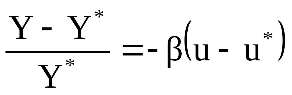 В левой части уравнения записана формула разрыва ВВП. В правой части u – это фактический уровень безработицы, u* - естественный уровень безработицы, поэтому (u - u*) – уровень циклической безработицы, - коэффициент Оукена (> 0). Этот коэффициент показывает, на сколько процентов сокращается фактический объем выпуска по сравнению с потенциальным (т.е. на сколько процентов увеличивается отставание), если фактический уровень безработицы увеличивается на 1 процентный пункт, т.е. это коэффициент чувствительности отставания ВВП к изменению уровня циклической безработицы. Для экономики США в те годы, по расчетам Оукена, он составлял 2.5%. Для других стран и других времен он может быть численно иным. Знак «минус» перед выражением, стоящим в правой части уравнения, означает, что зависимость между фактическим ВВП и уровнем циклической безработицы обратная (чем выше уровень безработицы, чем меньше величина фактического ВВП по сравнению с потенциальным).