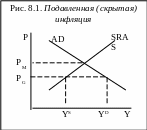 Подавленная (скрытая) инфляция имеет место в случае, когда цены устанавливает государство, причем на уровне ниже, чем равновесный рыночный (устанавливаемый по соотношению спроса и предложения на товарном рынке) (рис. 8.1.). Главная форма проявления скрытой инфляции – дефицит товаров.