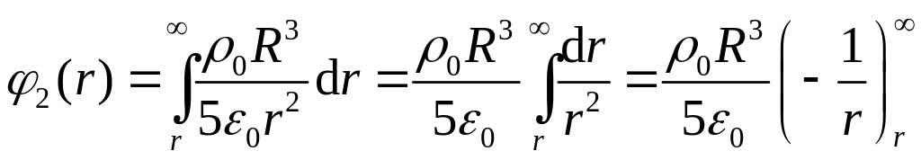 Область 2. (r > R). Оскільки напруженість в кожній області виражається різними функціями (1.3) і (1.4), розрахунок φ зручніше почати з області 2, в якій знаходиться нульова точка. Підставивши в (4) вираз (1.4) і r0 = ∞, отримаємо:
