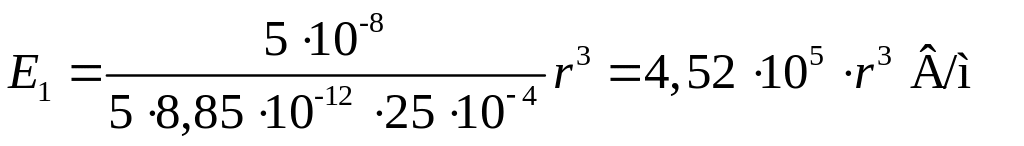 1.3. Числові формули. Для розрахунку таблиць значень і подальшої побудови графіків необхідно записати числові формули напруженостей та потенціалів, згідно з отриманими аналітичними виразами (1.3), (1.4), (1.6), (1.8) та умовами завдання. Для цього в аналітичні вирази треба підставити задані значення параметрів та констант (обов’язково в основних одиницях СІ) і виконати обчислення. В даному прикладі, згідно з умовою, ρ0 = 50 нКл/м3 = 5108 Кл/м3, R = 5 см = 5102 м, ε0 = 8,851012 Ф/м, отже