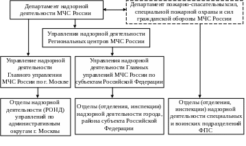 – структурные подразделения территориальных органов управления федерального органа исполнительной власти, уполномоченного на решение задач в области пожарной безопасности, созданные для организации и осуществления федерального ГПН на территориях субъектов Российской Федерации – управления надзорной деятельности Главных управлений МЧС России по субъектам Российской Федерации и их территориальные отделы (отделения, инспекции) надзорной деятельности;