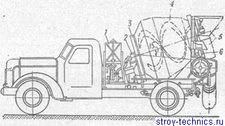 Автобетоносмесители (автобетоновозы) применяют для быстрого транспортирования смеси к месту работ, удаленных от центральной бетоносмесительной установки (рис. 149). Барабан 4 автобетоносмесителя имеет грушевидную форму и устанавливается на шасси грузового-автомобиля. При загрузке в барабан сухих компонентов машина выполняет роль бетоносмесителя, а при загрузке готового бетона — служит бетоновозом. В барабан, загруженный сухой смесью, за 5—10 мин до прибытия к месту назначения из дозировочного бачка 1 подается вода и включается механизм вращения барабана (8— 10 об/мин). При выгрузке барабан вращается в обратном направлении. Привод барабана осуществляется либо отбором мощности от двигателя автомобиля, либо от отдельного двигателя, установленного на раме шасси. Спереди барабан опирается бандажом на два опорных ролика 6, а сзади цапфой 2 на специальную стойку. Вращение барабану передается зубчатым венцом 3 или цепной передачей. Винтообразные лопасти укреплены на внутренней поверхности барабана так, что при вращении его в одном направлении они направляют материал в зону перемешивания, а в обратном — подают готовую смесь к разгрузочной воронке 5. Геометрический объем барабана автобетоносмесителя при загрузке сухими материалами заполняется на 60%, а при транспортировании бетонной смеси — на 80%. В СССР выпускают автобетоносмесители со смесительными барабанами полезной вместимостью 2500—4000 л.