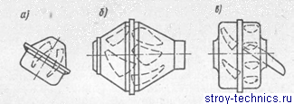 Рис. 144. Схемы смесительных барабанов гравитационного типа а — опрокидной; б — наклоняющийся; в — ненаклоняющийся с вводным лотком