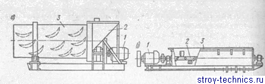 Рис. 148. Схемы бетоносмесителей непрерывного действия а — со свободным перемешиванием; б — с принудительным перемешиванием