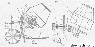 Рис. 146. Бетоносмеситель с наклоняющимся барабаном СБ-3