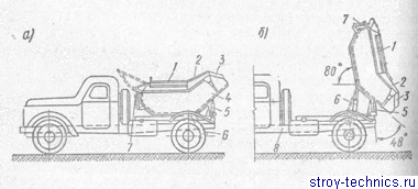 Рис. 150. Автобетоновоз а — в транспортном положении; б — в положении разгрузки