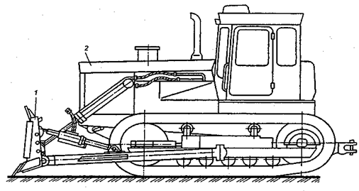 Бульдо́зер — самоходная землеройная машина, представляющая собой гусеничный или колёсный трактор, тягач и т. п. с навесным рабочим органом — криволинейным в сечении отвалом (щитом), расположенным вне базы ходовой части машины. Служит для послойного копания, планировки и перемещения (на расстояние 60-300 м) грунтов, полезных ископаемых, дорожно-строительных и др. материалов при строительстве и ремонте дорог, каналов, гидротехнических и т. п. сооружений. Также бульдозер применяется при разработке россыпей, на отвалах, при рекультивации, в качестве вспомогательной машины на карьерах. Кроме того, бульдозер используют при строительстве и ремонте дорог, а также как толкач (например, при заполнении самоходных скреперов) и т.п.