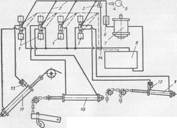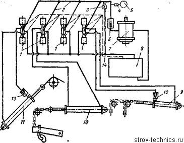 Рис. 2.39. Схема гидропривода грейдера-элеватора ДЗ-501; 1 — электрозолотники; 2 — рабочие трубопроводы; 3 — предохранительный клапан; 4 — демпфер; 5 — манометр; 6 — пластинчатый фильтр; 7 — насос; 8 — масляный бак; 9 — гидроцилиндр подъема нижней части транспортера; 10 — гидроцилиндр подъема плужной рамы; 11 — гидроцилиндр подъема верхней части транспортера; 12, 13 — клапаны-демпферы; 14 — дренажный трубопровод