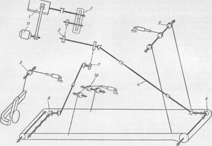 Рис. 4.32. Кинематическая схема грейдера-элеватора ДЗ-501: 1 — двигатель; 2 — центральный редуктор; 3 — цепная передача привода карданного вала транспортера; 4 — карданный вал транспортера; 5 — механизм подъема верхней части транспортера; 6 — редуктор ведущего барабана транспортера; 7 — цепная передача привода очистительного механизма; 8 — редуктор очистительного механизма;: 9 — механизм подъема плужной рамы; 10 — механизм подъема нижней части транспортера; И га генератор питания электрозолотников