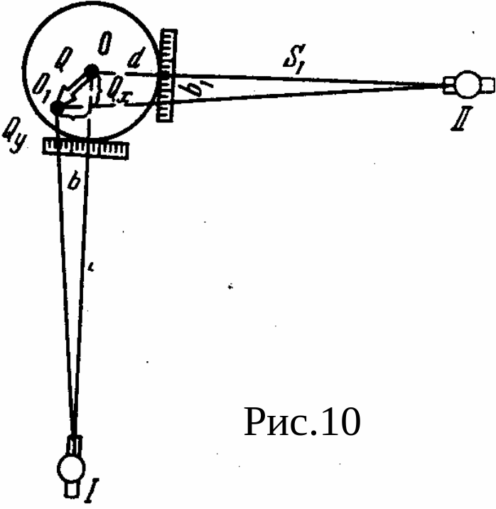 Так, в способе вертикального проектирования с двух точек I и II (рис.10), расположенных на взаимно перпендикулярных осях сооружения и на удалении от него в полторы-две высоты, с помощью теодолита проектируют определяемую верхнюю точку на некоторую плоскость в основании сооружения (цоколь, рейку, палетку и т. п.). Зная расстояние S от теодолита до сооружения и затем d до его центра О, из наблюдений в нескольких циклах, используя отсчеты b и b1, можно вычислить составляющие крена Qx и Qy по выбранным осям и полную величину крена Q.