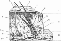 В этом геле содержится значительное количество связанной воды, которая обусловливает гладкость кожной поверхности. В молодой коже и коллагеновые волокна, и гликозоаминоглика- новый гель постоянно обновляются. С возрастом обновление межклеточного вещества дермы замедляется, уменьшается количество геля и количество связанной воды, накапливаются поврежденные волокна. Кожа теряет свою эластичность, появляются мелкие, а затем более глубокие морщины и складки кожи.