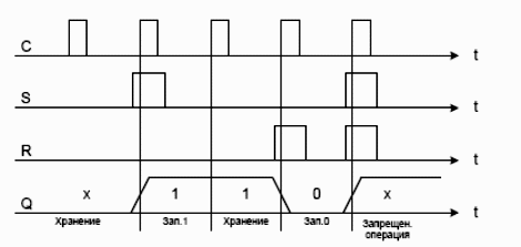Комбинационная схема управления асинхронным RS-триггером содержит два логических элемента И-НЕ. При С=0, независимо от входных информационных сигналов, на выходах схемы управления присутствуют пассивные единичные уровни сигналов, обеспечивающие режим хранения триггера. При С=1 оба логических элемента открыты для прохождения информационных сигналов, устанавливающих асинхронный RS-триггер в заданное состояние. Запрещенной комбинацией информационных сигналов является S=R=1. Условно-графическое отображение синхронного RS-триггера со статическим управлением приведено на рис. 8,б. Временная диаграмма работы триггера представлена на рис. 9.