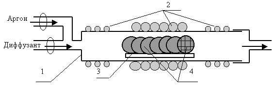 Собственно камера представляет собой кварцевую (или керамическую) трубу 1, снабжённую резистивными нагревателями 2 (3 секции с независимым регулированием температуры). Крайние секции поддерживают малый градиент температуры, обеспечивающий средней секции рабочую температуру до 1250°С с высокой точностью (до ±0,25°С). Именно в этой части камеры на кварцевом (или керамическом) держателе 3 располагаются обрабатываемые пластины 4, имеющие на рабочей поверхности оксидную маску. При выполнении загонки примеси или одностадийного процесса диффузии в камеру из внешнего источника непрерывно подаётся диффузант, представляющий смесь легирующей примеси (акцептор бор или донор фосфор) с транспортирующим газом (аргон).