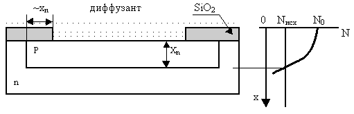 В подавляющем большинстве случаев легирующая примесь вводится в монокристаллический кремний с целью изменения типа проводимости и образования p-n-перехода на определённой глубине. Изменение типа проводимости имеет место в случае, если максимальная концентрация введённой примеси превышает концентрацию исходную (Nисх). Образование p-n-перехода происходит на глубине Хn, где концентрация введённой примеси оказывается равной исходной.