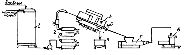1-резервуар для сквашивания; 2-трубчатый теплообменник; 3-барабанный обезвоживатель; 4-резервуар для сыворотки; 5-двухцилиндровый охладитель; 6-автомат для расфасовки и упаковки творога.