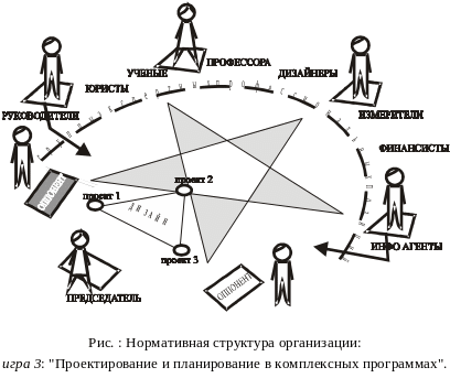 Мы приведем короткое описание не одной игры, а трех с тем , чтобы лучше выявить смысл нашего утверждения об удаче в третьей игре. Исследование коммуникации велось по методике нормативно-конфликтного анализа взаимодействий людей в ситуациях совместной деятельности [С.Г.Якобсон, А.А.Тюков]. В качестве базисного онтологического представления использовалась предложенная нами модель коммуникации. Нормативное представление о ситуации взаимодействия для всех игр предполагало декларацию: общего предмета обсуждения, разделения всех участников по позициям, равноправия любых мнений участников, объявление принципа запрета на межличностные оценки. По замыслу игр предполагалось обязательное латентное существование шести коммуникативных позиций-ролей.В каждой проведенной организационной игре мы всегда имели в виду нормативно ожидаемое коммуникативное поведения. Норма коммуникации обязательно принимается во внимание на стадии разработки оргпроекта (сюжета) и учитывается в сценарии предстоящей игры. Основные принципы игровой коммуникации прямо провозглашаются в приглашении каждому участнику игры. И в установочном докладе руководитель игры обязательно обращает внимание участников на соблюдение норм и правил коммуникативного обсуждения. В ряде сценариев проведенных игр коммуникативные позиции были включены непосредственно в сюжет. Выражаясь на традиционном языке психологических экспериментов, можно сказать, что в трех экспериментальных сериях исследования нами контролируемо, изменялась форма реализации проверяемой ("испытываемой") нормативной модели коммуникативного уровня многослойного взаимодействия людей в совместной деятельности. Участникам игр в той или иной форме предписывалась норма коммуникации предстоящей совместной деятельности в форме организационной игры.