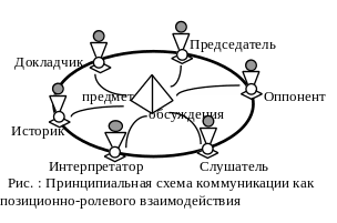 В “семислойке Тюкова” коммуникация - это пятый уровень и особая форма организации социальных взаимодействий людей, отличающаяся тем, что участники обсуждения занимают позиции-роли, равноправные по отношению к общему предмету обсуждения (см.: рис.15). При всей индивидуальности позиций в коммуникации участник должен занять одну из шести ролей: «председателя», «докладчика», «оппонента», «историка», «слушателя» и «интерпретатора». Более того, каждый участник полноценной коммуникации должен уметь “ходить по позициям” и “играть разные роли”. В этом и заключается и реальная сложность этой формы человеческого взаимодействия и психологическая трудность ее выполнения.