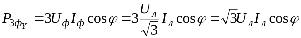 Як правило, застосовуються трипровідні кола трифазного струму без нульового провода. Для трифазного кола замінимо фазні напруги і струми на лінійні значення. Використавши формули (2.108) та (2.109) для з'єднання зіркою та формулу активної потужності (2.79):