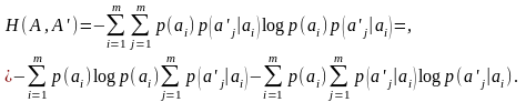 Let's consider a syllable from two letters aiai.. If the occurrence of a symbol depends only on what was in the message the previous symbol, formation of syllables from two letters describes by Marcovian simple circuit. Entropy of joint occurrence of two symbols define, applying operation of averaging on all volume of the alphabet: