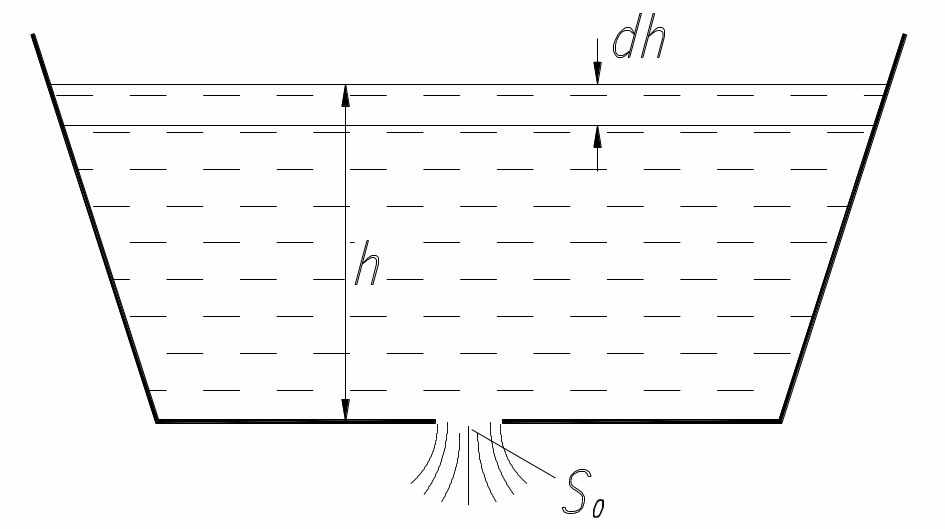 Обозначим переменную высоту уровня жидкости в сосуде, отсчитываемую от дна, через h, площадь сечения резервуара на этом уравне S(h), а площадь отверстия So, рис.8.3.