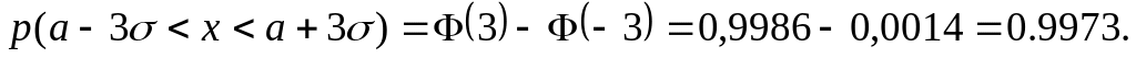 Следовательно, вероятность того, что значение случайной величины окажется вне этого интервала, равна 0,0027, то есть составляет 0,27% и может считаться пренебрежимо малой. Таким образом, на практике можно считать, что все возможные значения нормально распределенной случайной величины лежат в интервале