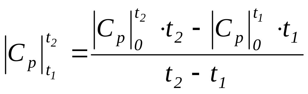 Величину Ср обычно находят по таблицам, в которых значения теплоемкостей приводятся для интервалов температур с началом отсчета 0 °С. Тогда среднюю теплоемкость для интервала температур от t1 до t2 можно определить по формуле: