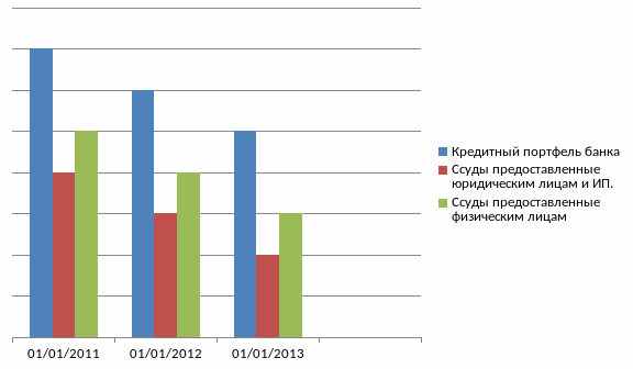 Из таблицы видно, что кредитный портфель отделения почти в равных долях состоит из ссудной задолженности юридических и физических лиц, с небольшим перевесом в сторону задолженности физических лиц. В течение анализируемого периода 2011-2012 г.г. произошло существенное уменьшение кредитного портфеля по ссудам, предоставленным как юридическим лицам, так и физическим лицам. На рисунке 12 представлена динамика изменения кредитного портфеля.