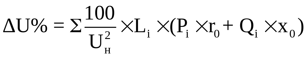 Если расчетная нагрузка потребителя в трехфазной линии задана величинами активной Pp и реактивной Qp мощностей, то для трехфазной магистральной линии с несколькими нагрузками (при одинаковых сечениях проводов или кабелей по всей длине линии) потеря напряжения (в %) определяется следующим образом: