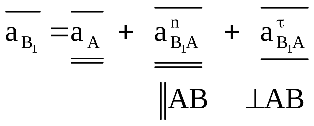 в индексе символа нормального ускорения первая буква означает, с какой точкой звена механизма совпадает начало, а вторая буква – к какой точке этого звена направлено острие вектора. Например, в уравнениях (1.9, 1.10) символика означает, что вектор нормального ускорения точки С во вращательном движении вокруг точки В приложен к точке С и направлен к точке В шатуна ВС.