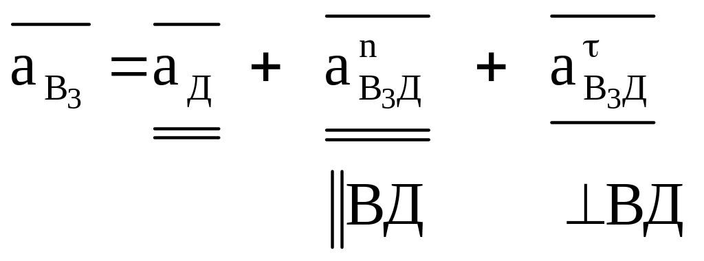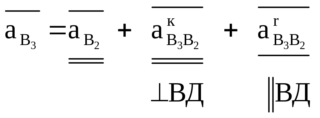 Если в точке В к кривошипу присоединить кулисную группу с внутренней поступательной кинематической парой, то точка В1 кривошипа АВ, точка В2 ползуна 2 и точка В3 кулисы ВД в данный момент геометрически совпадут и уравнения связи между ускорениями этих точек примут следующий вид (рис. 1.4):