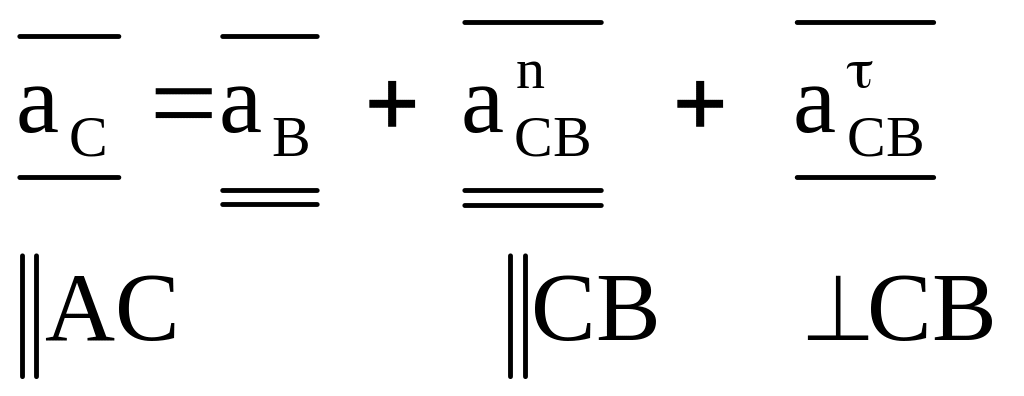 Если в точке В к кривошипу АВ присоединить структурную группу с внутренней вращательной кинематической парой в точке С, то уравнение связи между ускорениями этих точек будет иметь следующий вид:
