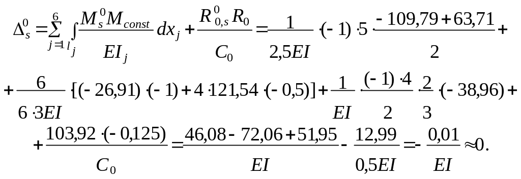 Для выполнения этой проверки используются усилия в выбранной вспомогательной ОСМС от единичного основного неизвестного метода сил Xi = 1. Перемещение по направлению i - й удалённой лишней связи, которое должно быть равным нулю, определяется как