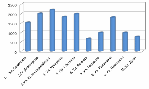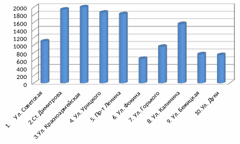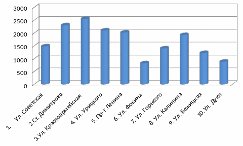 Наблюдения за интенсивностью движения автотранспорта проводились на следующих улицах Советского района: Советской, пр-т Ст.Димитрова, Красноармейской, Урицкого, пр-т Ленина, Фокина, Горького, Калинина, , Дуки, Бежицкой.