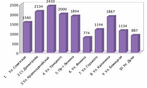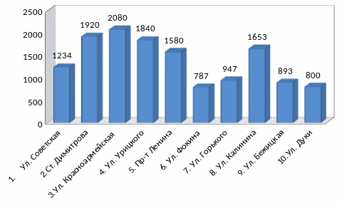 Наибольшая интенсивность движения наблюдалась по ул. Красноармейской , Ст.Димитрова, ул.Урицкого, наименьшая – по ул. Фокина и Дуки.
